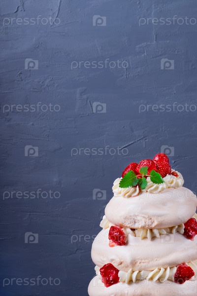 Торт Павлова со взбитыми сливками и клубникой на сером фоне. Копировать пространство
