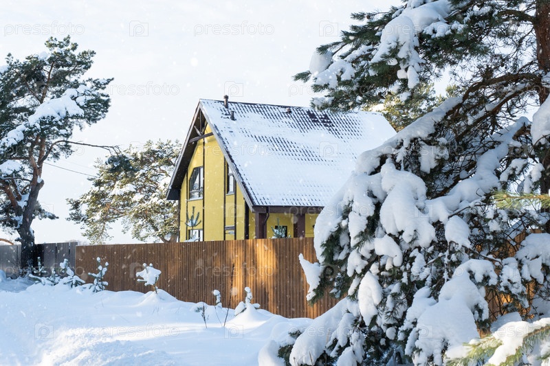 Желтый уютный дом в снегу зимой в деревне окружен соснами. Заснеженная крыша, трубы отопления и вентиляции, трапециевидные окна