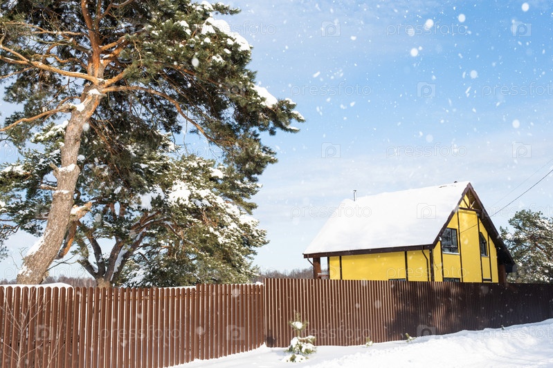 Желтый уютный дом в снегу зимой в деревне окружен соснами. Заснеженная крыша, трубы отопления и вентиляции, трапециевидные окна