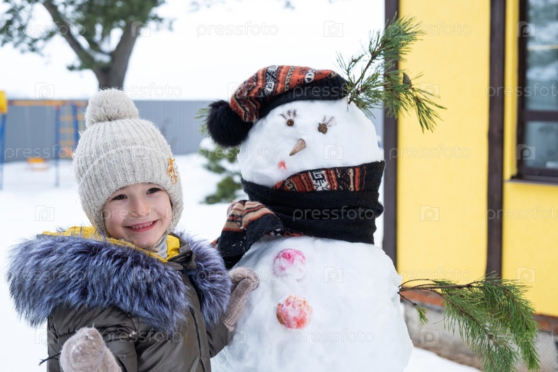 Ребенок раскрашивает лицо снеговика красками - зимнее развлечение и творчество, лепить снеговика зимой на улице