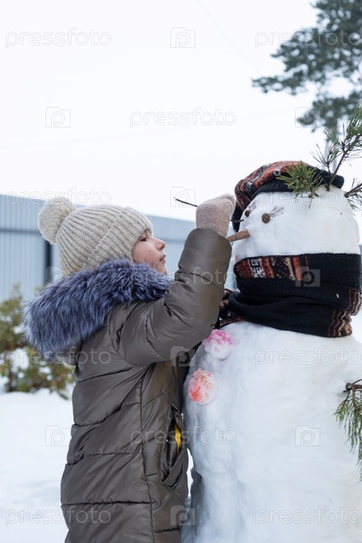 Ребенок раскрашивает лицо снеговика красками - зимнее развлечение и творчество, лепить снеговика зимой на улице