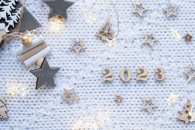 С Новым годом - деревянные буквы и цифры 2023 на праздничном белом вязаном фоне с блестками, звездами, огнями гирлянд. Привет, открытка. Календарь, обложка