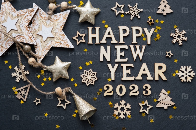 С Новым годом - деревянные буквы и цифры 2023 на праздничном черном фоне с блестками, звездами, огнями гирлянд. Привет, открытка. Календарь, обложка