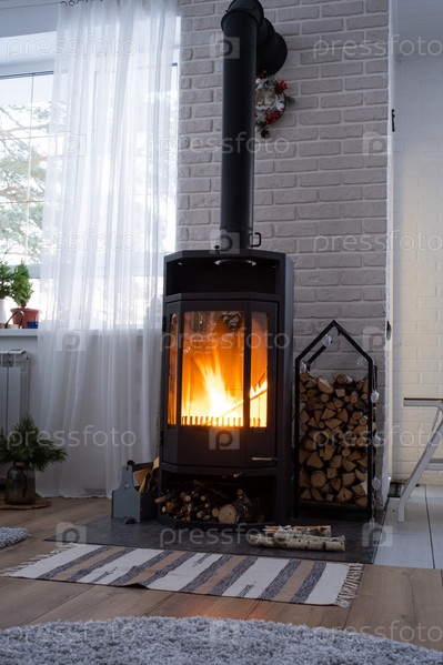 Черная печь, камин в интерьере дома в стиле лофт. Альтернативное экологичное отопление, теплая уютная комната дома, дрова