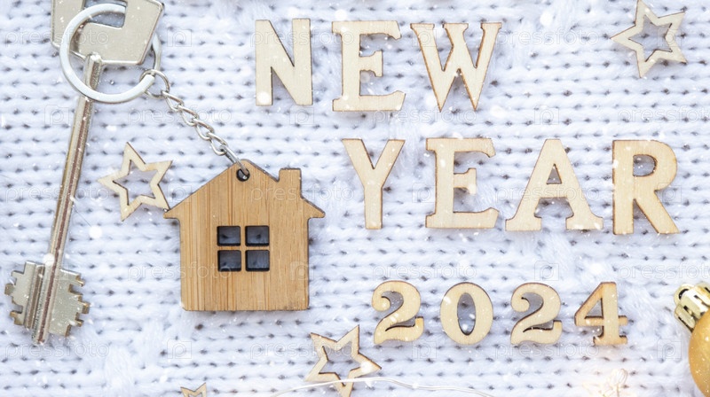 Ключ от дома с брелком на праздничном вязаном фоне со звездами, огнями гирлянд. С Новым 2024 годом - деревянные буквы, поздравительная открытка. Покупка, строительство, переезд, ипотека