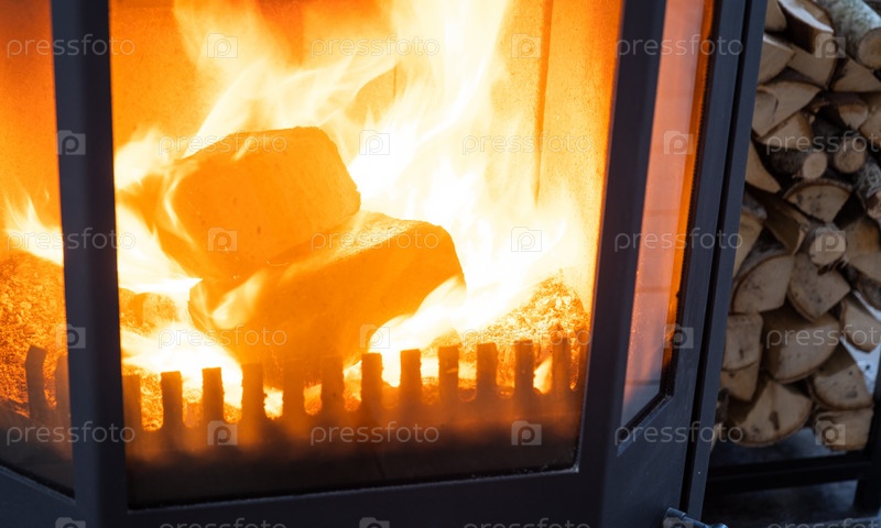 Топливные брикеты из прессованных опилок для растопки печи - экономичная альтернатива экологически чистому топливу для камина в доме. Дрова горят в печи в интерьере