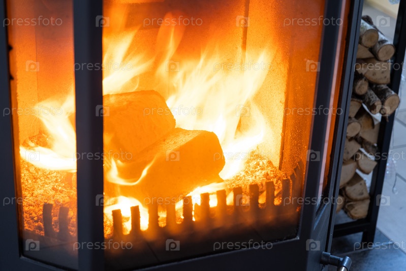 Топливные брикеты из прессованных опилок для растопки печи - экономичная альтернатива экологически чистому топливу для камина в доме. Дрова горят в печи в интерьере