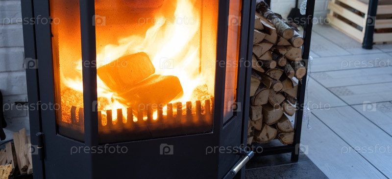 Топливные брикеты из прессованных опилок для растопки печи - экономичная альтернатива экологически чистому топливу для камина в доме. Дрова горят в печи в интерьере