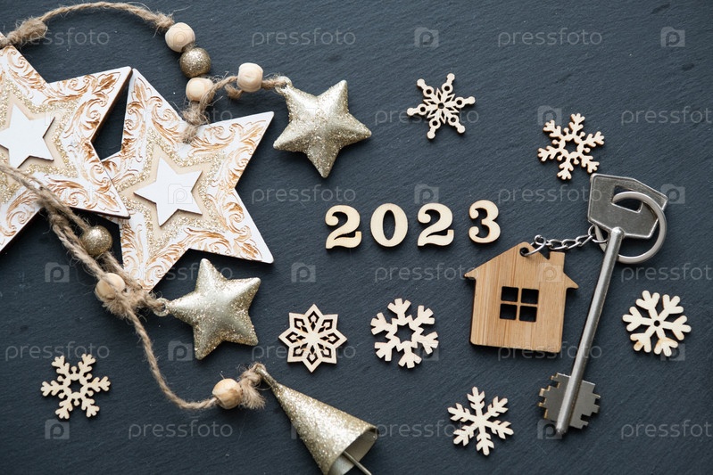 Ключ от дома с брелком на черном фоне со звездами, снежинками. С Новым 2023 годом - деревянные буквы, поздравительная открытка. Покупка, строительство, переезд, ипотека