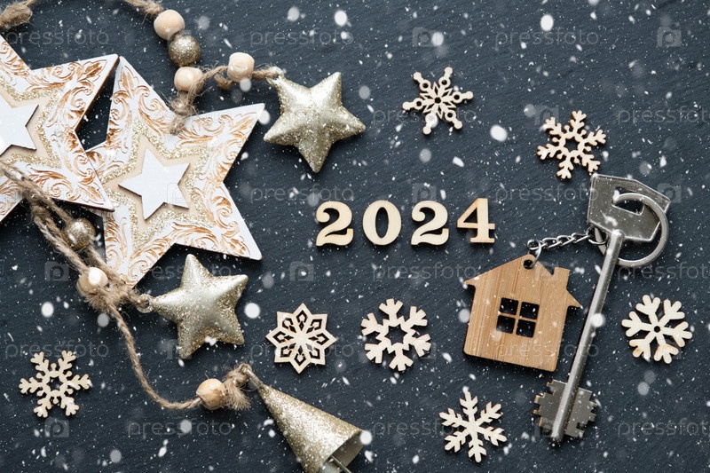 Ключ от дома с брелком на черном фоне со звездами, снежинками. С Новым 2024 годом - деревянные буквы, поздравительная открытка. Покупка, строительство, переезд, ипотека