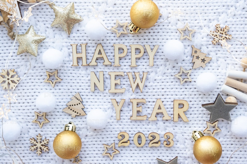 С Новым годом - деревянные буквы и цифры 2023 на праздничном белом вязаном фоне с блестками, звездами, огнями гирлянд. Привет, открытка. Календарь, обложка