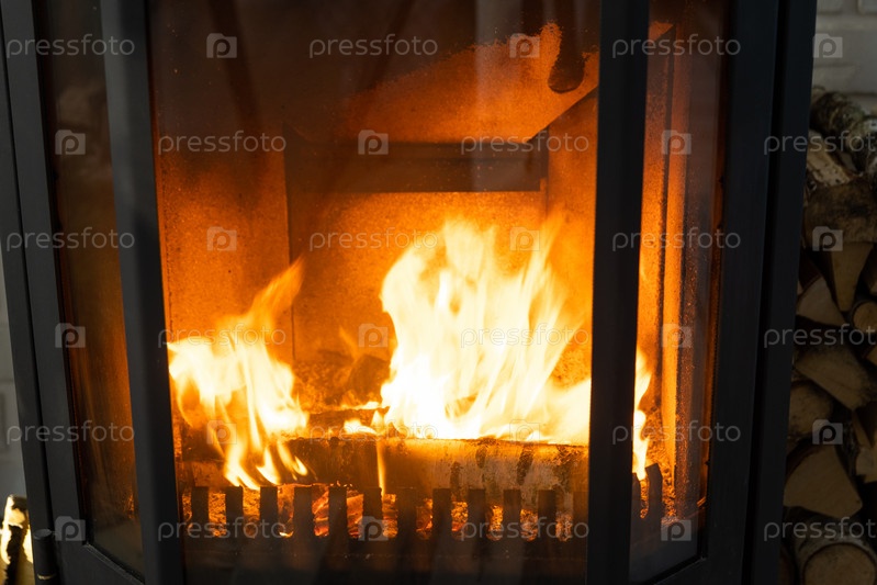 Дрова горят в топке очага крупным планом. Альтернативное экологичное отопление, теплая уютная комната дома, дрова