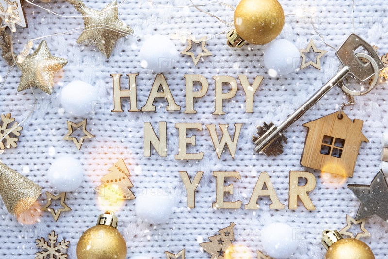 Ключ от дома с брелком на праздничном вязаном фоне с блестками, звездами, огнями гирлянд. С Новым годом - деревянные буквы, поздравительная открытка. Покупка, строительство, переезд, ипотека