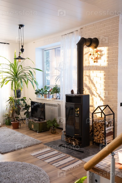 Черная печь, камин в интерьере дома в стиле лофт. Альтернативное экологичное отопление, теплая уютная комната дома, дрова