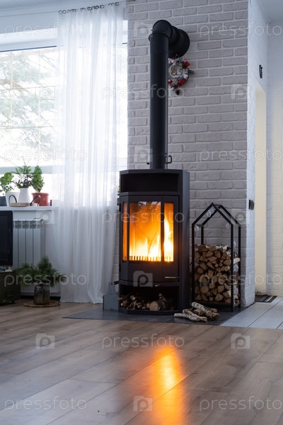 Черная печь, камин в интерьере дома в стиле лофт. Альтернативное экологичное отопление, теплая уютная комната дома, дрова