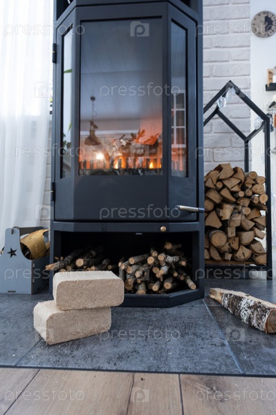 Топливные брикеты из прессованных опилок для растопки печи - экономичная альтернатива экологически чистому топливу для камина в доме. Дрова горят в печи в интерьере