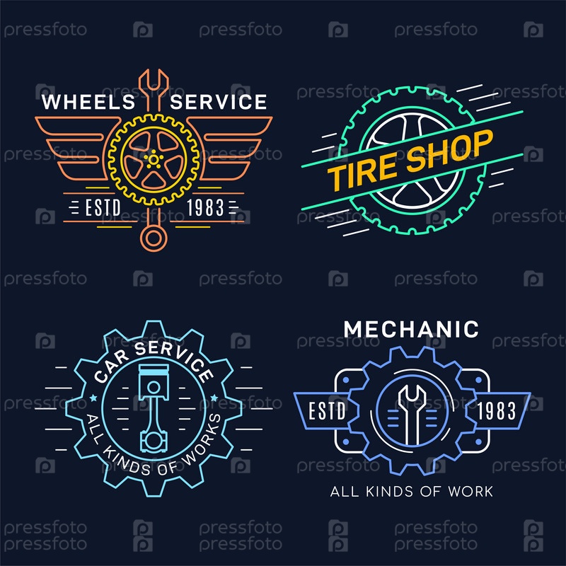 Набор автосервиса и дизайна значков ремонта. Иконка цветовой линии на темном фоне. Сервис по ремонту колес, магазин шин, ремонт автомобилей, магазин автозапчастей