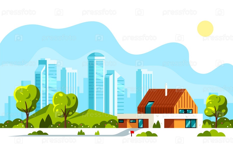 Современная иллюстрация экстерьера коттеджа, здание виллы. Большой город с небоскребами на заднем плане. Концепция баннера в плоском стиле