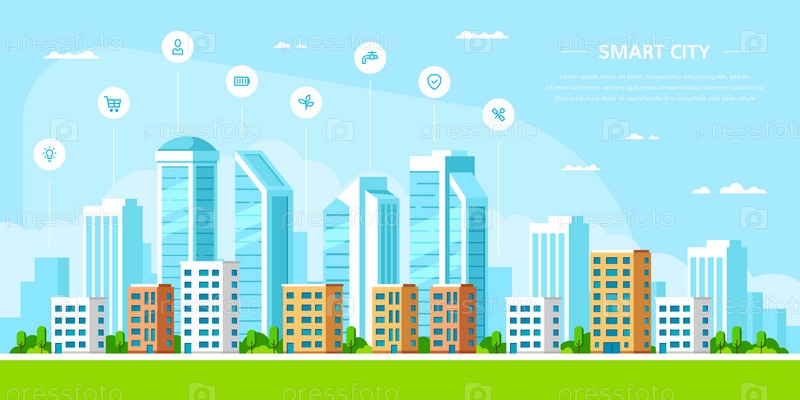 Дизайн баннера концепции умного города в плоском стиле, дизайн баннера концепции умного города в плоском стиле