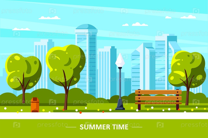 Общественный парк в городе со скамейкой, деревьями и уличным фонарем. Большой город на заднем плане. Летний фон. Дизайн баннера в плоском стиле