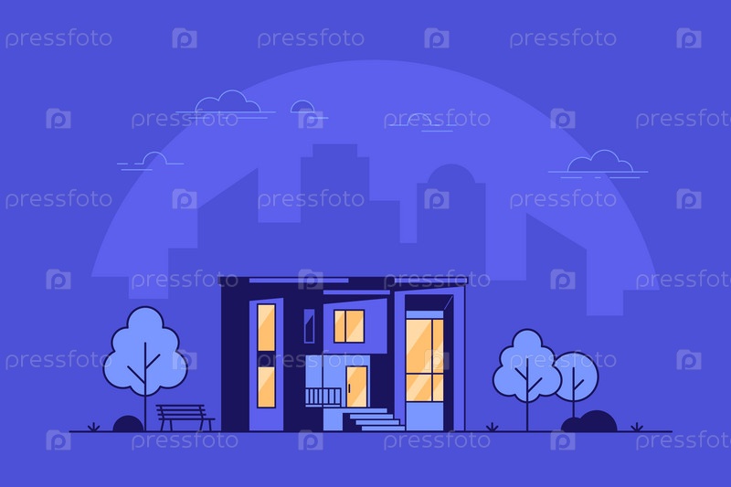 Современная иллюстрация экстерьера коттеджа, здание виллы. Большой город с небоскребами на заднем плане. Концепция баннера в плоском стиле