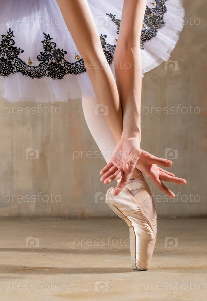 Нога в пуантах под пачкой и руками балерины на фоне бежевой стены