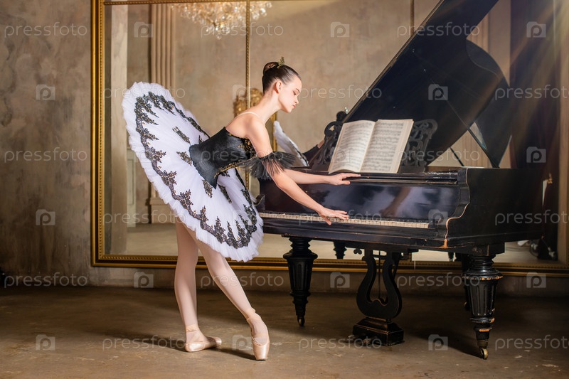 Молодая балерина в белой пачке играет на красивом старом рояле