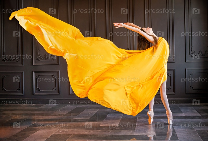 Элегантная балерина в пуантах танцует с развевающейся желтой тканью на темно-сером фоне