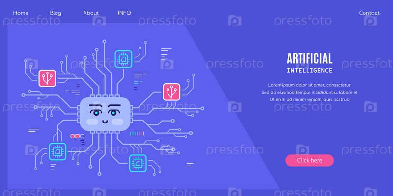 Искусственный интеллектуальный концептуальный дизайн баннера. Веселое лицо на печатной плате вектора. Иллюстрация процессора. Иллюстрация в плоском стиле
