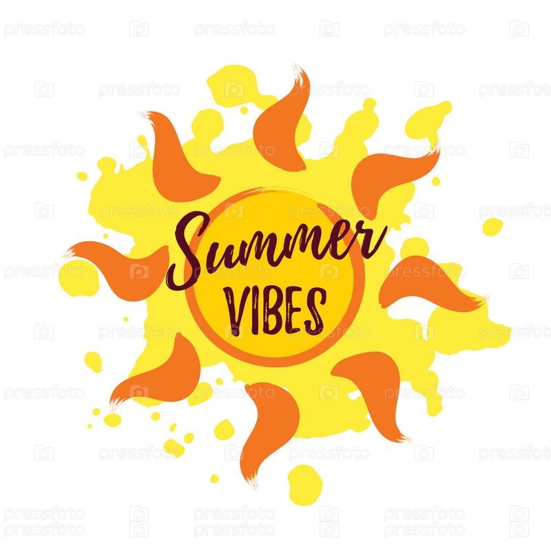 Солнце с надписью Summer Vibes и капли краски на заднем плане. изолированы на белом фоне