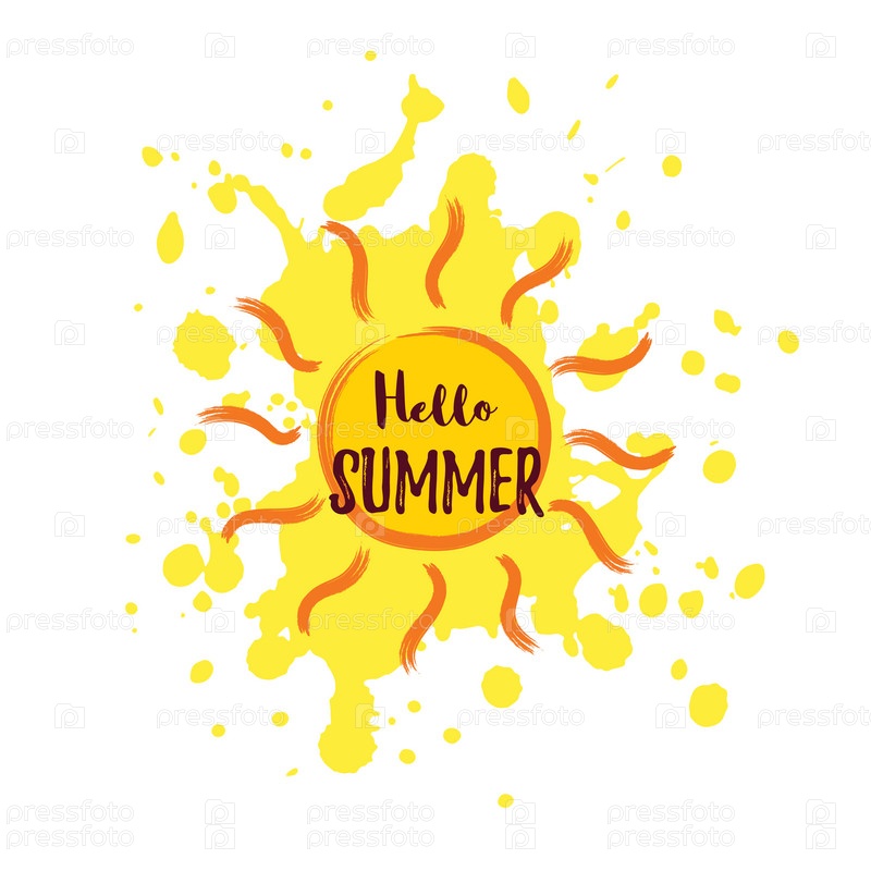 Солнце с надписью 'Доброе лето' и капли краски на заднем плане. изолированы на белом фоне