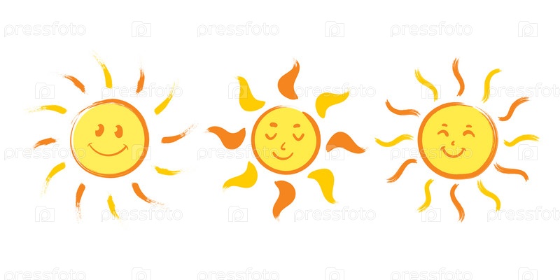 Набор нарисованных от руки веселых улыбающихся летних икон, выделенных на белом фоне. Летние флюиды и концепция привет лета