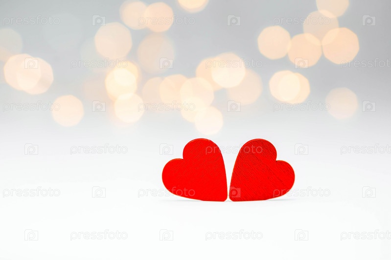 Баннер. Фон для Дня святого Валентина. два сердца с праздничными огнями боке на заднем плане. макет пригласительного билета на вечеринку в честь дня влюбленных, пространство для копирования