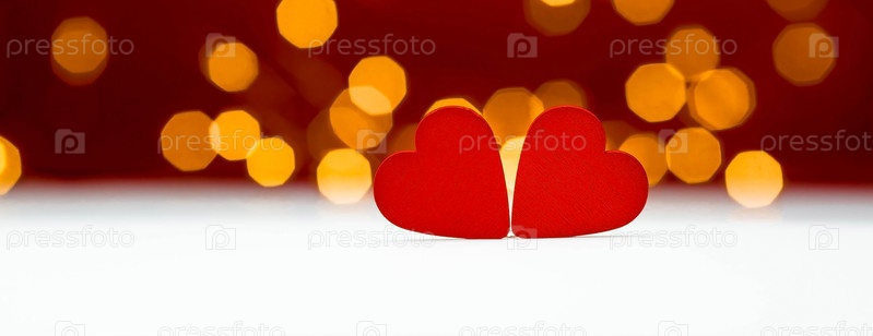 Баннер. Фон для Дня святого Валентина. два сердца с праздничными огнями боке на заднем плане. макет пригласительного билета на вечеринку в честь дня влюбленных, пространство для копирования