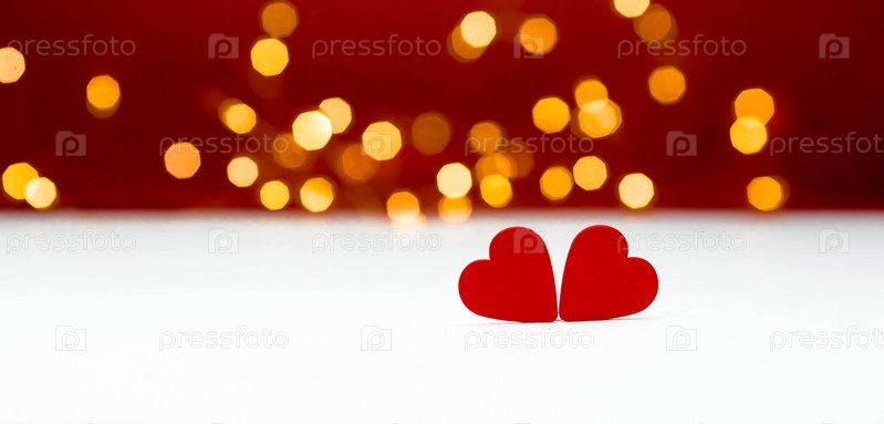 Баннер. Фон для Дня святого Валентина. два сердца с праздничными огнями боке на заднем плане. макет пригласительного билета на вечеринку в честь дня влюбленных, пространство для копирования