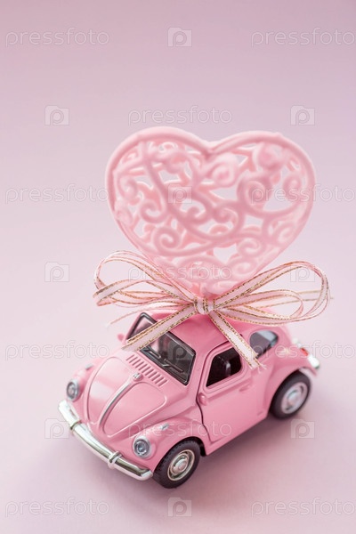 МОСКВА, РОССИЯ - ФЕВРАЛЬ 2022: Розовый ретро игрушечный автомобиль доставляет большое сердце на крышу. Концепция доставки товаров в День святого Валентина. Доставка подарков. 8 марта, Международный женский день