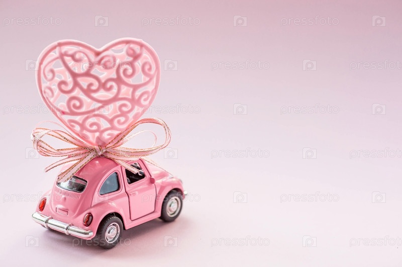 МОСКВА, РОССИЯ - ФЕВРАЛЬ 2022: Розовый ретро игрушечный автомобиль доставляет большое сердце на крышу. Концепция доставки товаров в День святого Валентина. Доставка подарков. 8 марта, Международный женский день