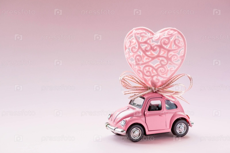 МОСКВА, РОССИЯ - ФЕВРАЛЬ 2022: Розовый ретро игрушечный автомобиль доставляет большое сердце на крышу. Концепция доставки товаров в День святого Валентина. Доставка подарков. 8 марта, Международный женский день