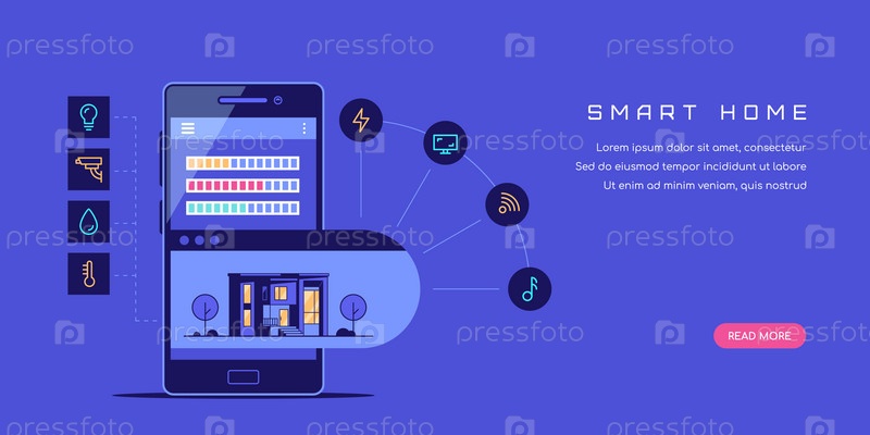 Баннер концепции умного дома. Современная вилла со смартфоном и иконами. Иллюстрация в плоском стиле