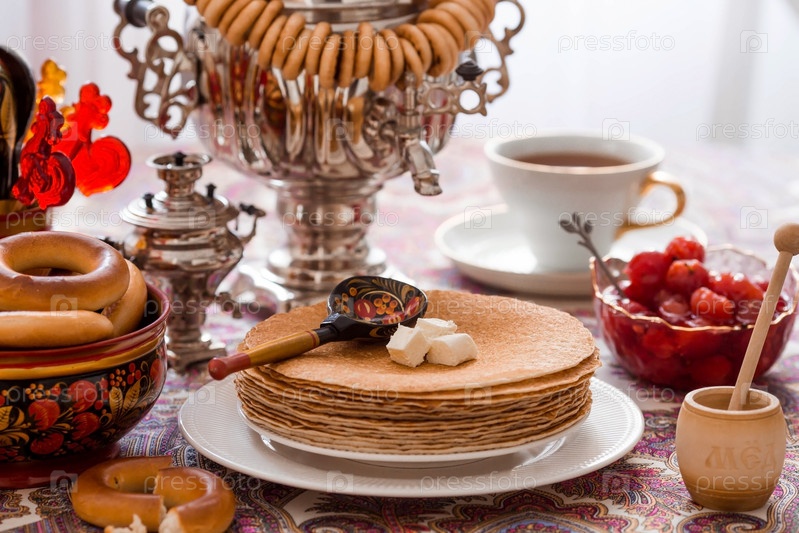 Русские традиции. Русский праздник Масленица. Натюрморт с чашкой чая, стопкой блинов, сметаной, медом, кубиками масла, рогаликами, сухофруктами, карамельным петушком и самоварами