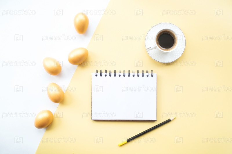 Золотые пасхальные яйца, кофейная кружка и блокнот с местом для текста на желтом фоне. Модная плоская укладка. Минимальная концепция