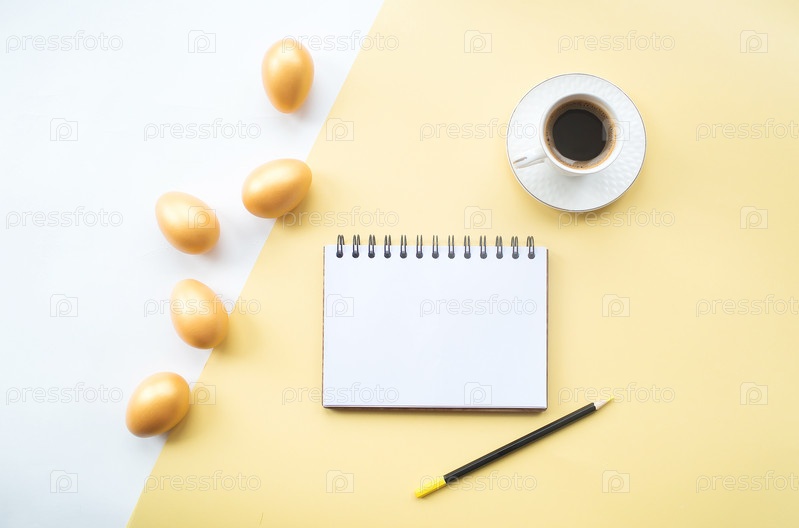 Золотые пасхальные яйца, кофейная кружка и блокнот с местом для текста на желтом фоне. Модная плоская укладка. Минимальная концепция