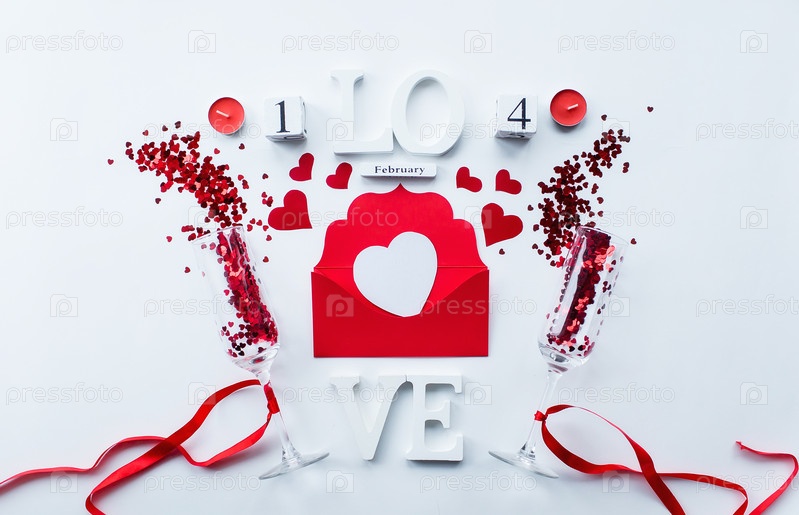 Бокалы для шампанского, любовное письмо и слово любовь на белом фоне вид сверху. День святого Валентина фон