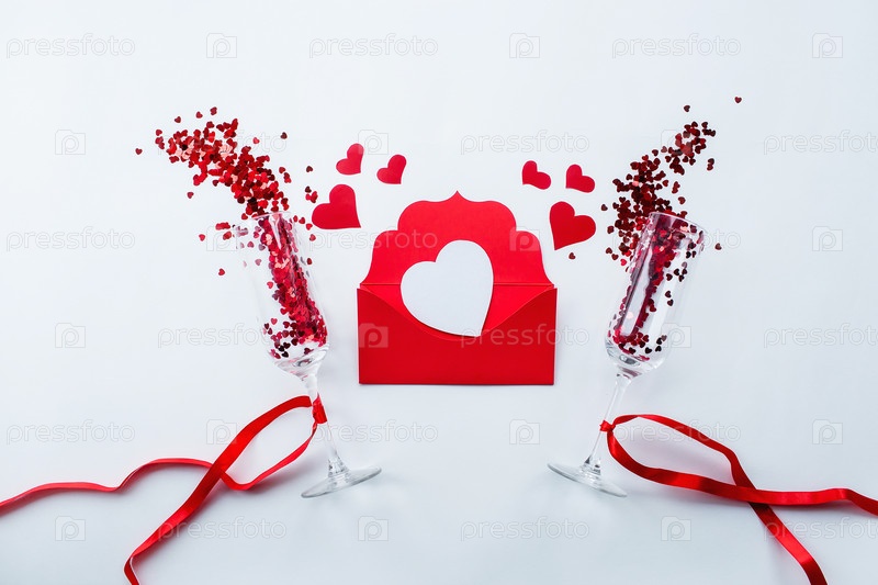 Бокалы для шампанского, любовное письмо и слово любовь на белом фоне вид сверху. День святого Валентина фон