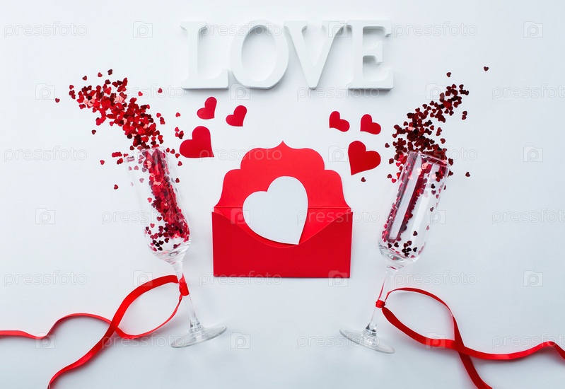 Бокалы для шампанского, любовное письмо и слово любовь на белом фоне вид сверху. День святого Валентина фон