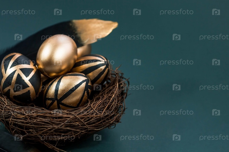 Золотые, черные, белые яйца на модном изумрудном фоне. Геометрия. Минимальная концепция. Вид сверху. Пасхальная открытка с копией места для текста