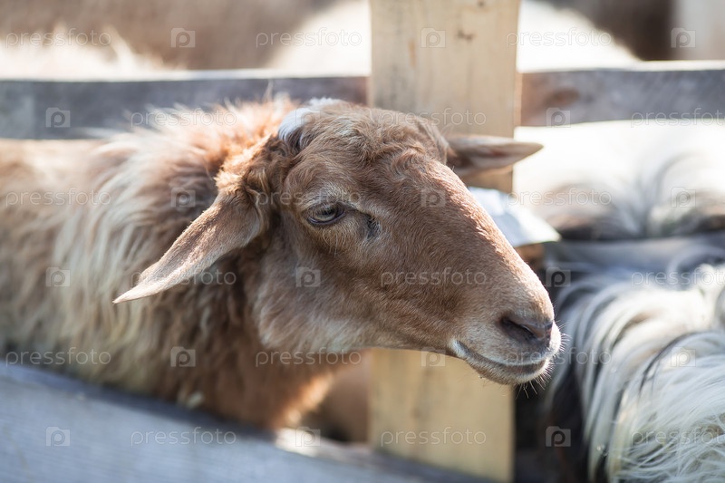 Скот. Овца в загоне. Концепция животноводства и сельской жизни. Портрет овец на свежем воздухе. Крупный план. Домашнее животное на частной эко ферме. Сельскохозяйственная промышленность