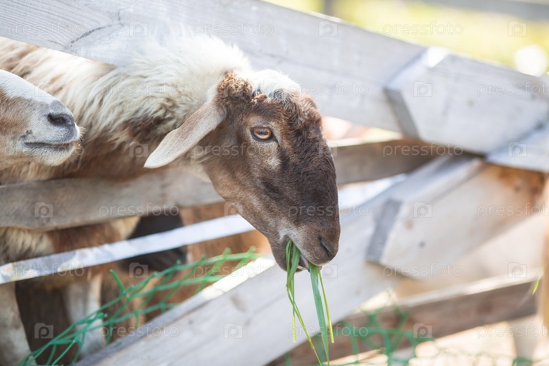 Скот. Овца в загоне. Концепция животноводства и сельской жизни. Портрет овец на свежем воздухе. Крупный план. Домашнее животное на частной эко ферме. Сельскохозяйственная промышленность