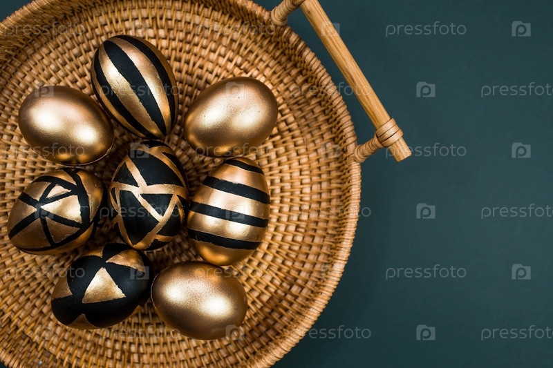 Золотые, черные, белые яйца на модном изумрудном фоне. Геометрия. Минимальная концепция. Вид сверху. Пасхальная открытка с копией места для текста