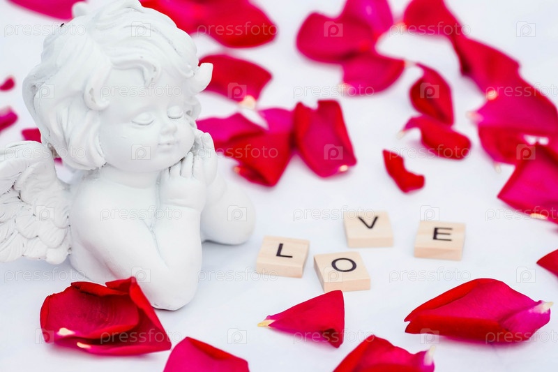 Слово «Любовь» и милый ангел на белом мраморном фоне. Любовь на деревянных кубиках. Тема любви. День Святого Валентина. Деревянные блоки со словом любовь. Положительные эмоции